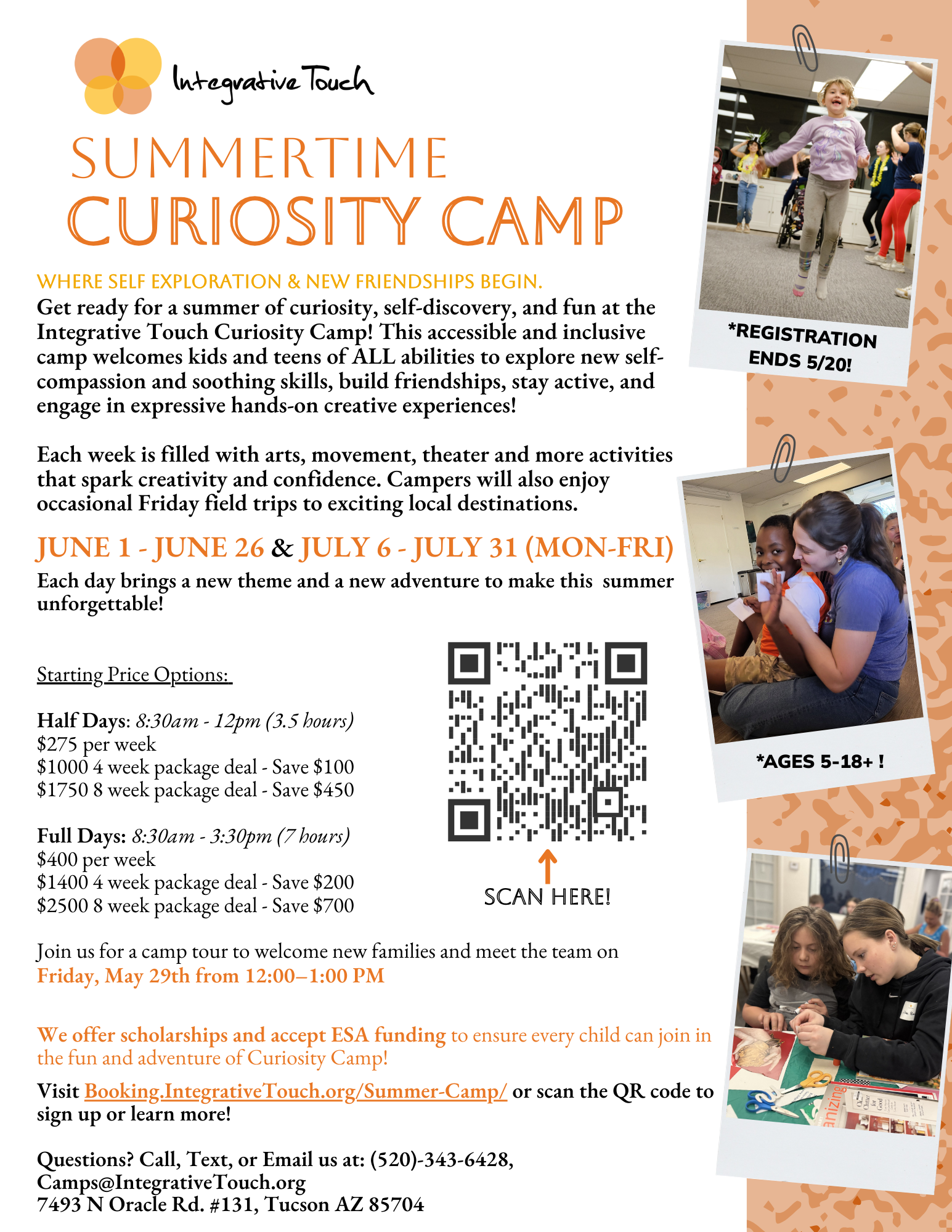 🔹 Description: Get ready for a summer of curiosity, self-discovery, and creative fun at Curiosity Camp! This accessible and inclusive fun-filled camp welcomes kids and teens of ALL abilities to build friendships, and discover new self-care and compassion skills, through expressive movement, theatrics, creative hands-on arts and crafts, and a handful of special field trips! Each day brings a new theme and a new adventure to make each summer week truly unforgettable!